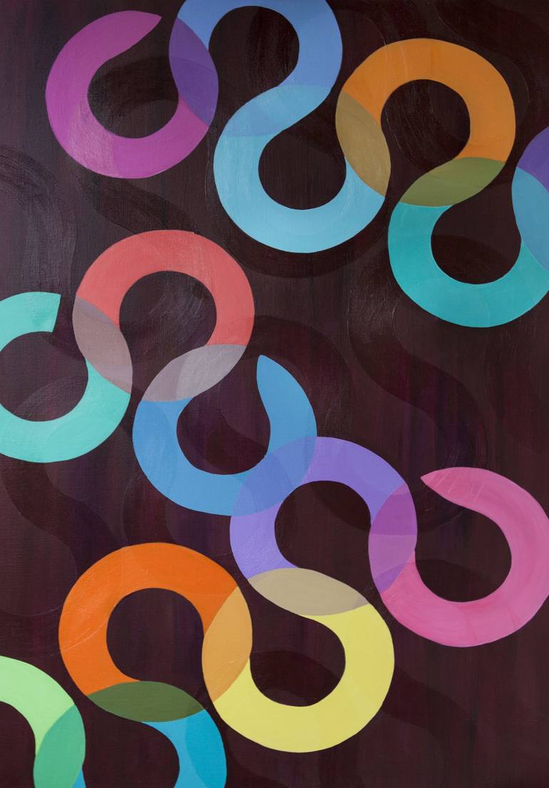 This abstract geometric painting, measuring 90 × 130 cm, is built around a rhythm of interlocking circular forms set against a dark, atmospheric background. The main composition is complemented by a translucent layer that mirrors and repeats the shapes of the primary elements, creating a sense of vi...