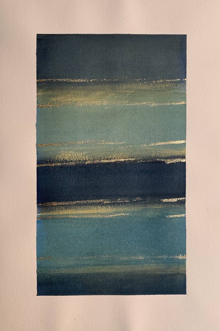 This painting is a study in color. Color theory is both the science and art of using color, and the visual effects of how colors mix, match or contrast with each other. This work began with a layer of yellow ochre. Followed by layers of indigo, prussian blue and phthalo blue. Artwork featuring thi...