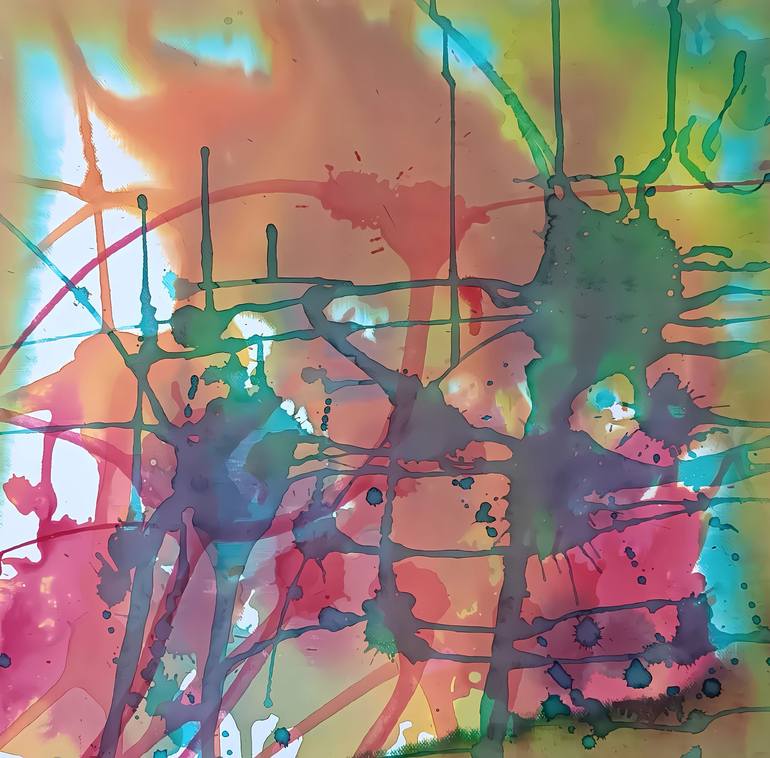 Easter Colors Painting is a vibrant explosion of movement and color, created with fluid watercolor techniques on canvas. Swirls of aquamarine, fuchsia, yellow, and maroon interlace across the surface, giving life to an energetic abstract composition. A subtle grid of fine lines weaves through the sc...