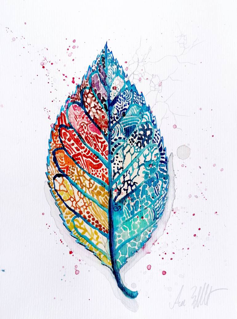 A small format artwork inspired in the leaf form and patterns. On the one hand I am respecting the natural shape and the main veins of the leaf. On the other hand I am filling the spaces in between with imaginary patterns, making different color and shape combinations. It was painted using watercolo...