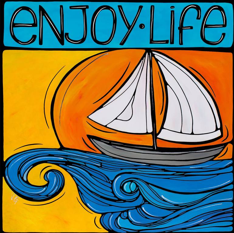 A vibrant art of a sailboat on blue waves with motivational "Enjoy Life" text, evoking a sense of adventure and positivity. Ideal for promoting a carefree lifestyle.