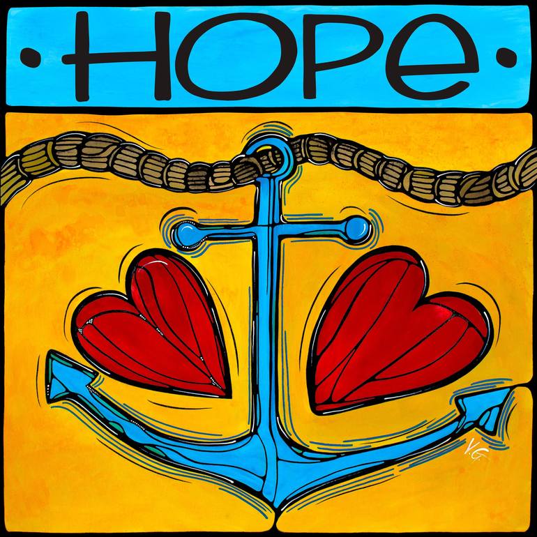 Vibrant artwork featuring a blue anchor intertwined with red hearts and a bold hope text, set against a bright background. Symbolizes love, hope, and nautical themes.