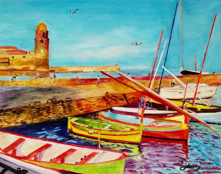 Oil painting - unique work Colorful boats and village of Collioure in France