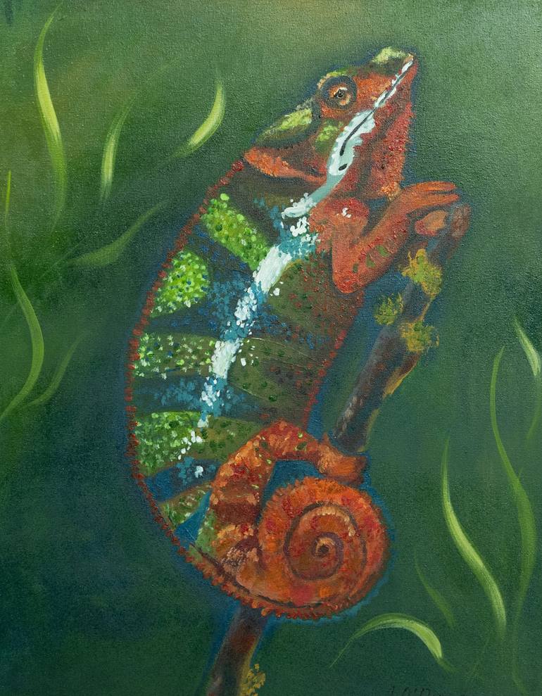 A captivating painting depicting the intricate beauty of a chameleon. The vibrant hues of emerald and orange meld seamlessly against a rich, textured green backdrop, capturing the chameleon's innate ability to adapt and camouflage within its environment. The chameleon's mesmerizing eyes reflect a s...
