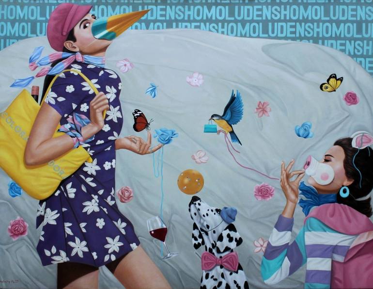 The portrayal of a happy and colorful atmosphere during a Halloween party. Material : Canvas Medium : Acrylic Size : 180 X 140 Cm