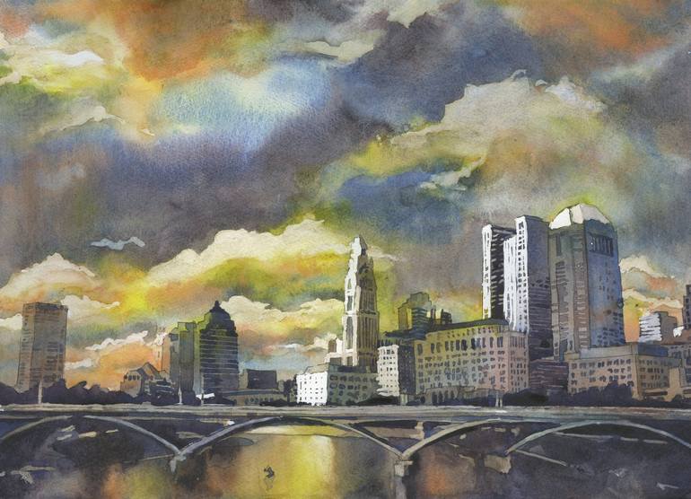 Columbus, OH skyline at sunset. Watercolor painting of Columbus, Ohio at sunset architecture Columbus skyline Ohio artwork cityscape coloful art. 11x15" unframed watercolor painted on 140lb Fabriano Artistico professional watercolor paper. Hand signed by artist (not pictured). Ryan Fox is a sign...