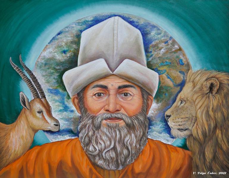 Come Souls let's become One The face of Hacı Bektaş-I Veli is looking at the audience. The green mole expressed in the narratives appears on his face. There is a gazelle on one side and a lion on the other. Lights expressing the inclusiveness of the message are emanating from the world, which symbol...