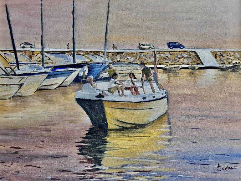 In this vibrant oil painting titled "Returning at Sunset," a sailboat comes back with its sails furled, revealing only its majestic masts as it glides towards the harbor. The water reflects golden and orange hues that blend with the horizon. Along the shores, the harbor's stones add a rustic touch...