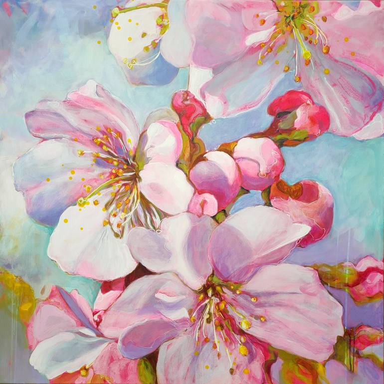 This large semi-abstract painting features a captivating composition of delicate cherry blossoms, set against a light blue background that evokes a serene, tranquil atmosphere. The flowers are rendered in soft hues of pink, violet, and cerulean, with touches of white adding a sense of lightness and ...