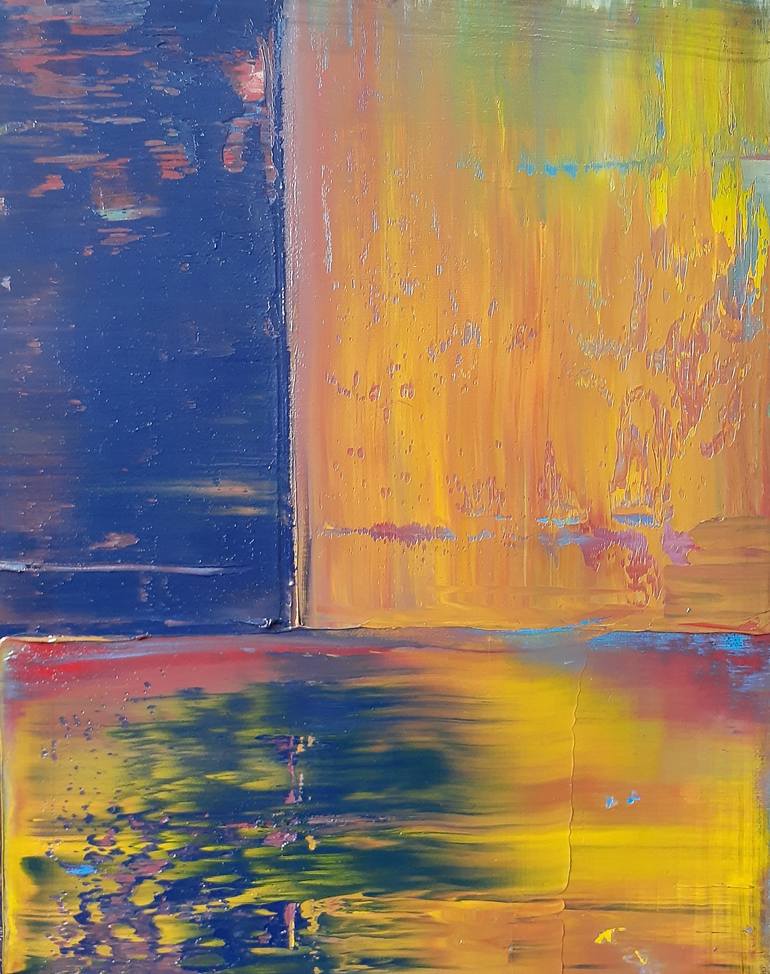 This a squeegee painting, I've been working with the squeegee technique for a while now. This canvas has been devided into three unequal parts. Each part is squeegeed over with thick layers of oil paint. Decisions about colour, shapes and compartments are made on the easel for the accidental element...