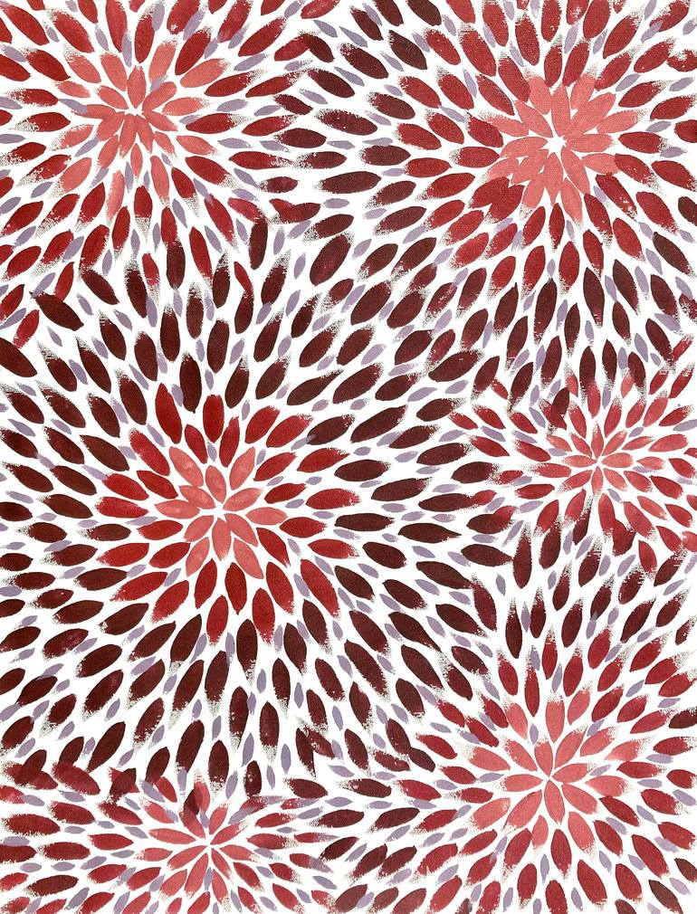 Acrylic paint on cotton canvas. Shades of pink and red painted as blossoming flowers all over the canvas. Painting shipped rolled safely secured in a tube with certificate of authenticity.