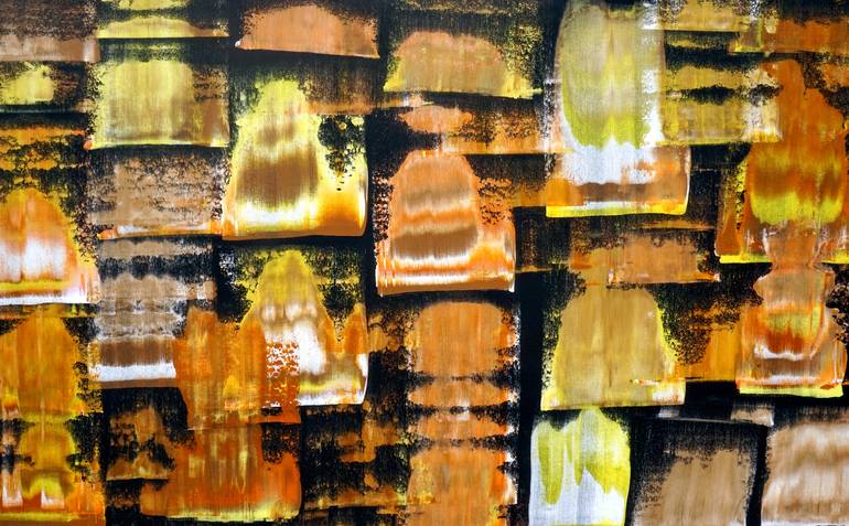 Acrylic on canvas. Brown, orange, yellow and white colours painted on black background. This is one of my favourite techniques that captures motion really well. Large strokes painted to capture movement in one direction.