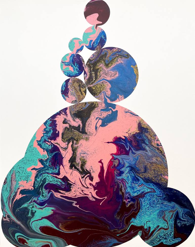 The artist was born in Nicosia, Cyprus (October 1987), where she currently lives and works. She holds a DNAP, (Diplôme National d’Arts Plastiques), from the Ecole Supérieure des Beaux-arts de Nîmes, as well as a DNAP and a DNSAP, (Diplôme National Supérieur d’Arts Plastiques), from the Ecole Nationale Supérieure des Beaux-arts de Paris, France, obtained with Distinction. Eleni Pratsi produces artworks with geometric compositions and explosive, liquescent colours. She utilises both painting and printmaking techniques, evoking a balance between creative control and affirmation of chance, which extends throughout all the works. Every composition is created from experimentation with different colour combinations and the infinite possibilities that surface through the repetition, overlap and juxtaposition of circles. The use of stencil, a meticulously cut-out original which meets the canvas, creates sometimes sealed, and other times porous boundaries for the vivid colours that are poured directly on it. The colour palette is influenced by pop culture, developments in pigments and industrial paint production, which Pratsi continually researches. The paint, whose density is specific but different every time, interacts within the in-between space of canvas and stencil in ways that are often surprising. The specifics of gravity, which carries the paint on the painterly surface, play an important part in the creation of colour drips and blocks. Having developed a special relationship to the materiality of painting and the multiplicity of printmaking, Pratsi proposes images that do not impose a fixed meaning but invite the eye to travel within otherworldly landscapes, seen as if from above. The visual and emotional connections one can make, lead to different interpretations of the works. The title of the exhibition, “La Vie en Ronde”, can be interpreted to refer to the “roundness” of life, that feeling of things being mysteriously tied to each other, turning on their own accord, flowing, mixing, and mingling on endless horizons. Evagoras Vanezis Art Theorist