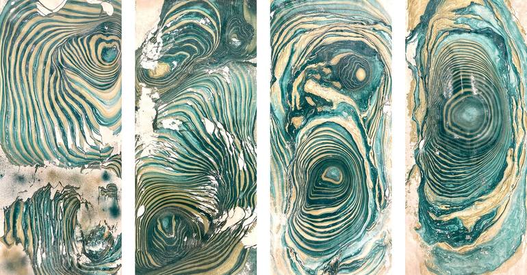 Acrylic paint, spray paint and gloss varnish on primed cotton canvas. Each panel is 44x20 inches (112x50 cms) each. Artworks are shipped rolled safely in a tube. It is advised to get them gallery wrapped stretched instead of framing.