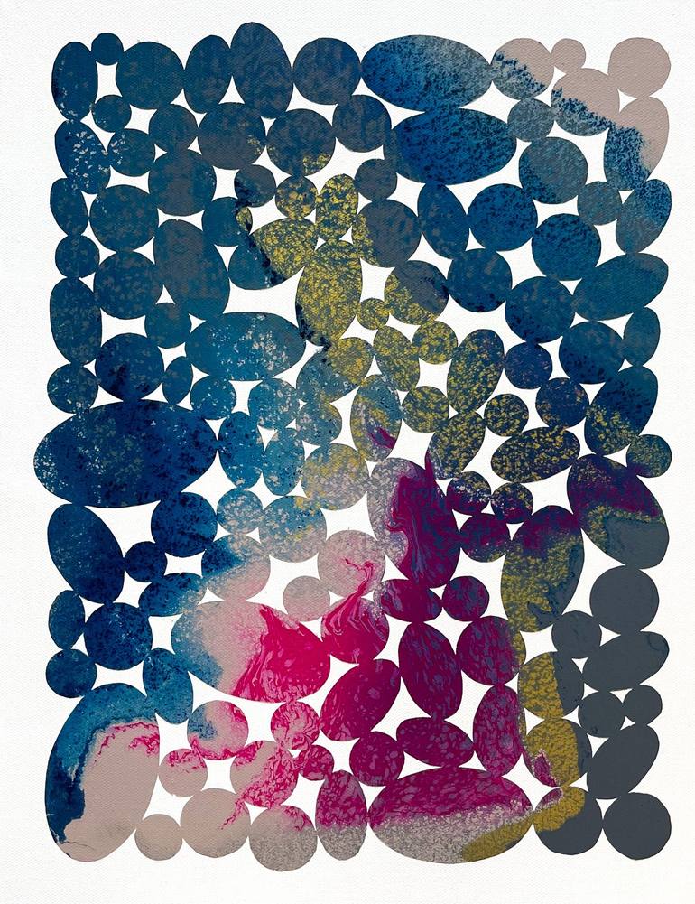 The artist was born in Nicosia, Cyprus (October 1987), where she currently lives and works. She holds a DNAP, (Diplôme National d’Arts Plastiques), from the Ecole Supérieure des Beaux-arts de Nîmes, as well as a DNAP and a DNSAP, (Diplôme National Supérieur d’Arts Plastiques), from the Ecole Nationale Supérieure des Beaux-arts de Paris, France, obtained with Distinction. Eleni Pratsi produces artworks with geometric compositions and explosive, liquescent colours. She utilises both painting and printmaking techniques, evoking a balance between creative control and affirmation of chance, which extends throughout all the works. Every composition is created from experimentation with different colour combinations and the infinite possibilities that surface through the repetition, overlap and juxtaposition of circles. The use of stencil, a meticulously cut-out original which meets the canvas, creates sometimes sealed, and other times porous boundaries for the vivid colours that are poured directly on it. The colour palette is influenced by pop culture, developments in pigments and industrial paint production, which Pratsi continually researches. The paint, whose density is specific but different every time, interacts within the in-between space of canvas and stencil in ways that are often surprising. The specifics of gravity, which carries the paint on the painterly surface, play an important part in the creation of colour drips and blocks. Having developed a special relationship to the materiality of painting and the multiplicity of printmaking, Pratsi proposes images that do not impose a fixed meaning but invite the eye to travel within otherworldly landscapes, seen as if from above. The visual and emotional connections one can make, lead to different interpretations of the works. The title of the exhibition, “La Vie en Ronde”, can be interpreted to refer to the “roundness” of life, that feeling of things being mysteriously tied to each other, turning on their own accord, flowing, mixing, and mingling on endless horizons. Evagoras Vanezis Art Theorist