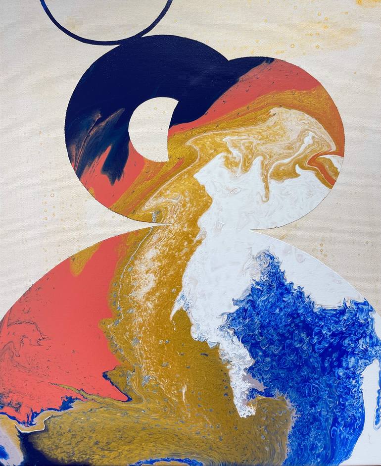The artist was born in Nicosia, Cyprus (October 1987), where she currently lives and works. She holds a DNAP, (Diplôme National d’Arts Plastiques), from the Ecole Supérieure des Beaux-arts de Nîmes, as well as a DNAP and a DNSAP, (Diplôme National Supérieur d’Arts Plastiques), from the Ecole Nationale Supérieure des Beaux-arts de Paris, France, obtained with Distinction. Eleni Pratsi produces artworks with geometric compositions and explosive, liquescent colours. She utilises both painting and printmaking techniques, evoking a balance between creative control and affirmation of chance, which extends throughout all the works. Every composition is created from experimentation with different colour combinations and the infinite possibilities that surface through the repetition, overlap and juxtaposition of circles. The use of stencil, a meticulously cut-out original which meets the canvas, creates sometimes sealed, and other times porous boundaries for the vivid colours that are poured directly on it. The colour palette is influenced by pop culture, developments in pigments and industrial paint production, which Pratsi continually researches. The paint, whose density is specific but different every time, interacts within the in-between space of canvas and stencil in ways that are often surprising. The specifics of gravity, which carries the paint on the painterly surface, play an important part in the creation of colour drips and blocks. Having developed a special relationship to the materiality of painting and the multiplicity of printmaking, Pratsi proposes images that do not impose a fixed meaning but invite the eye to travel within otherworldly landscapes, seen as if from above. The visual and emotional connections one can make, lead to different interpretations of the works. The title of the exhibition, “La Vie en Ronde”, can be interpreted to refer to the “roundness” of life, that feeling of things being mysteriously tied to each other, turning on their own accord, flowing, mixing, and mingling on endless horizons. Evagoras Vanezis Art Theorist