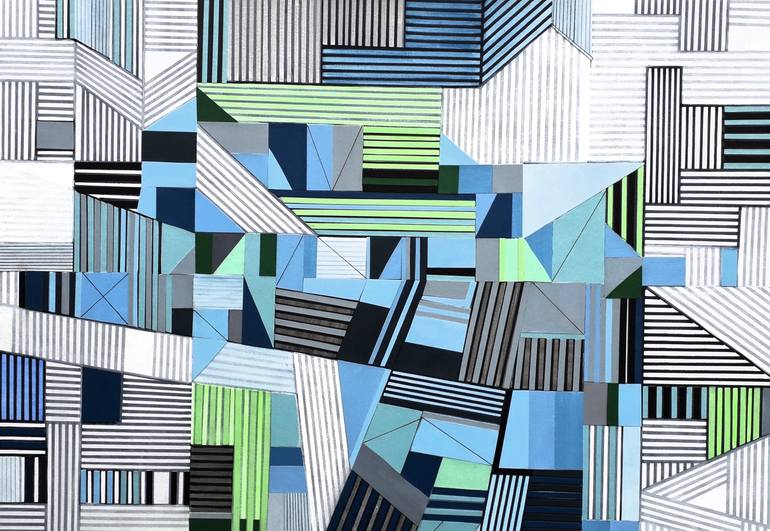 Composition in Blue & Green is one of my latest work this year, a painting with a mixed media style on panel board, use of painted paper and drawing into the paint, geometric shapes and form building up in layers with painted paper ( acid free ) a feeling of an architecture space. Trying to develop...