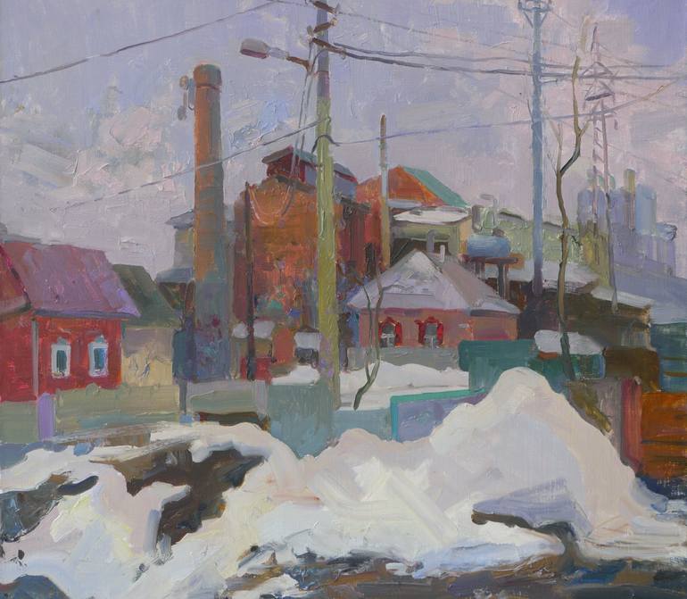 The landscape was painted in spring in Chernihiv. Often times I am attracted to places that are not interesting to ordinary people. This landscape interested me with its multilevel and organic blend of parts. The old confectionery factory, with pipes and walls, is surrounded by small residential bui...