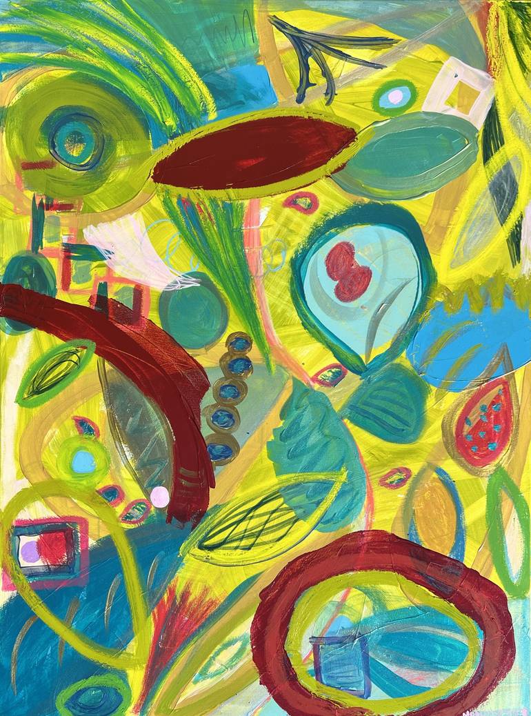 This large multimedia painting is in a new series I'm working on with a lot of color and symbolism. This piece is about the lightness of being that comes with getting your deepest darkest secrets out into the open.