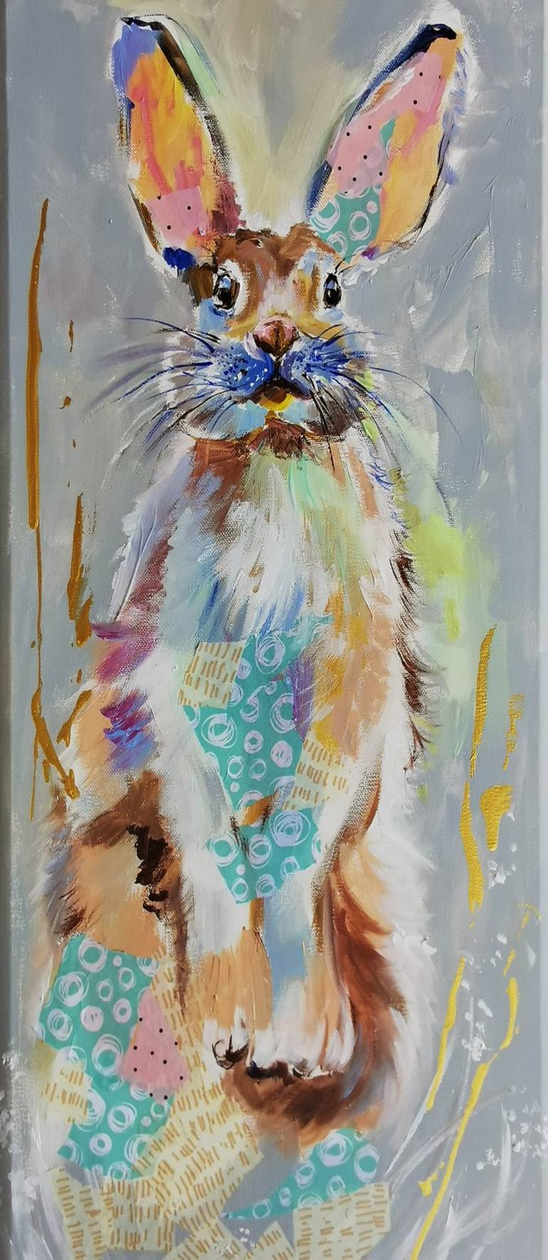 Title: Coniglio Size: 80 x 30 cm (12" x 31") This oil painting with a colourful rabbit features beautiful texture strokes with a slight silky sheen. Every expressive touch on the canvas tells us a story of Life on Earth, and how it's exciting to be alive. This is my story on canvas about amazing an...