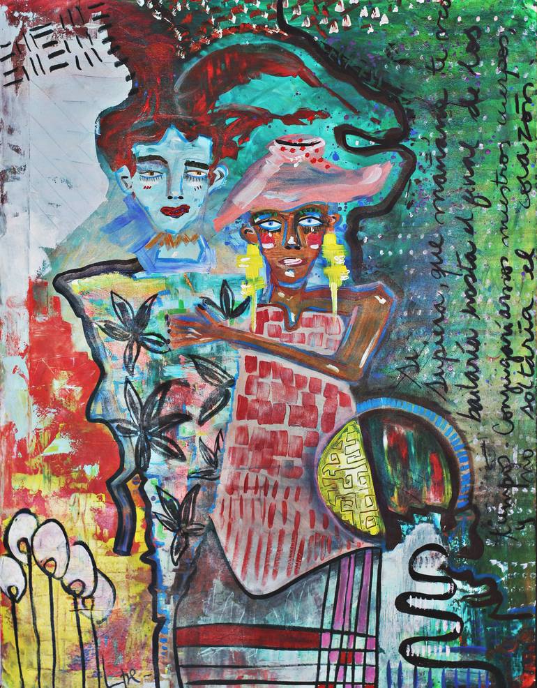 Conjugacion de cuerpos de otra época translates to /conjugation of bodies from other times/ "Si supiera, que mañana te veo, bailaría hasta el final de los tiempos. Conjugaríamos nuestros cuerpos y no soltaría el corazón" This paining is about a couple from a different era, being portrayed while dan...