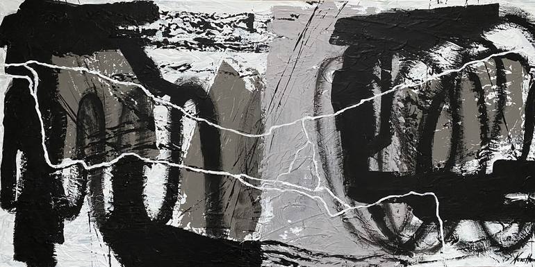 This expansive, original abstract painting in shades of black, grey, and white serves as a profound portrayal of the invisible bond between two entities. It transcends the boundaries of gender, skin color, nationality, religious beliefs, political attitudes, and cultural backgrounds. In its essence,...