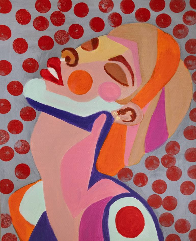 This is a vibrant female portrait set against a backdrop of red polka dots. The artwork portrays the female figure in an abstract, geometric style, using bold, bright colors. The portrait features striking character and dynamic line patterns, making it a perfect addition to any interior. Created wi...
