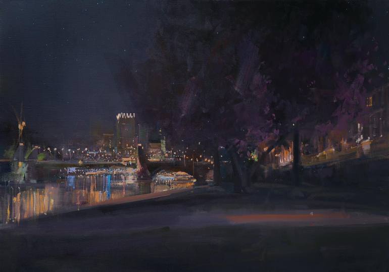 Experience the allure of Frankfurt with this original, contemporary cityscape painting. I capture the vibrant energy of the city at night, as it relaxes into a beautiful display of evening lights. This impressionist piece evokes the inviting atmosphere of a late evening stroll with a friend. Crafte...