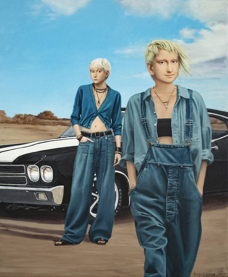 I aimed to capture the essence of youthful defiance and carefree spirit in a realistic yet stylized manner. The characters, with their bold stares and casual demeanor, embody a sense of independence. They stand confidently before a classic backdrop, highlighting a narrative of freedom and the persi...