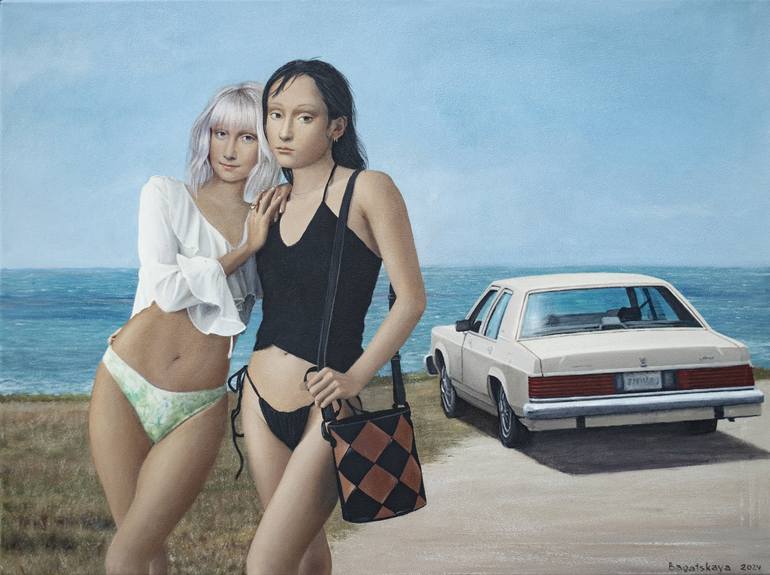 This captivating artwork features a sunlit seascape with two young women standing prominently in the foreground. The woman on the right, dressed in a sleek black bikini and carrying a checkered crossbody bag, combines strength and grace with her somber expression contrasting the bright daylight. Her...