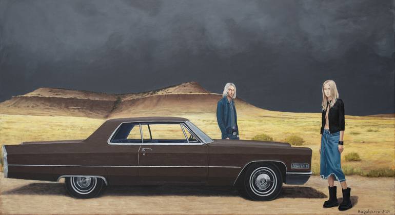 The artwork portrays a vast, empty desert beneath a stormy sky. A vintage brown car stands alone, its sleek design contrasting with the barren landscape. Two figures, separated yet still connected to the desolation, add a sense of quiet introspection. One blends with the dark surroundings, while the...