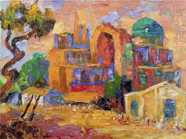 The painting conveys dynamism and vitality, creating the atmosphere of a warm sunny day. The architectural oriental forms of the buildings, depicted in bright colors, seem almost fairy-tale-like, and their unusual outlines attract attention. The sky fills the picture with soft light, and the vegeta...