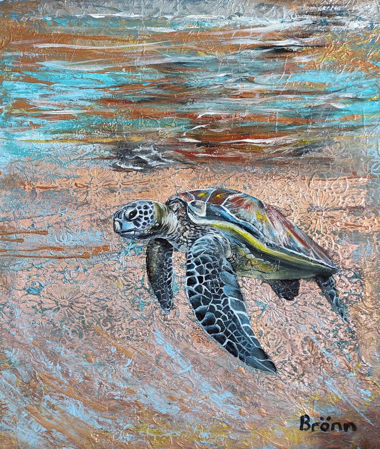 The oil painting depicts a serene scene of a turtle swimming gracefully in a sea of shimmering copper leaf. The turtle's shell is a deep shade of brown, contrasting beautifully against the warm tones of the copper sea. The reflection on the surface of the water is a stunning display of colors. The...