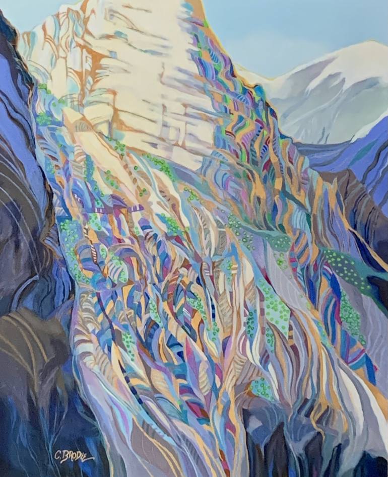 Mountains near the Tioga Pass in the Sierra Mountains. A symbolic homage to my grandfather who was a rock hound and who taught me to love the mountains. This painting is part of a series of paintings about the Sierras. The copper is archival acrylic paint which is light-fast. It is painted on ca...