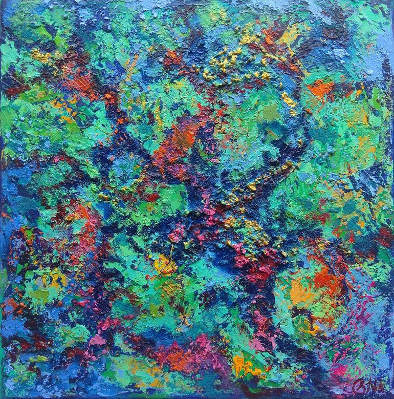Immerse yourself in the mesmerizing beauty of an underwater world with this stunning textured oil painting by artist Olga Nikitina. Created using sand to add texture, this artwork depicts a vibrant and abstract coral reef, bursting with bright and captivating colors. The artist's skilled use of a pa...