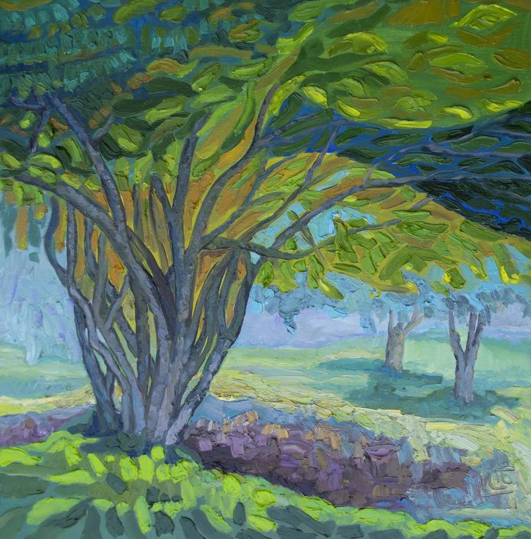 This is an original oil painting in cotton canvas.60x80 / 23.6"x23.6". The mixed branches of the tree were very attractive, I gave a decorative solution to them. I have used multi-dimensional green colors alongside iridescent paints in an impasto style to highlight bright day. The use of rich textu...