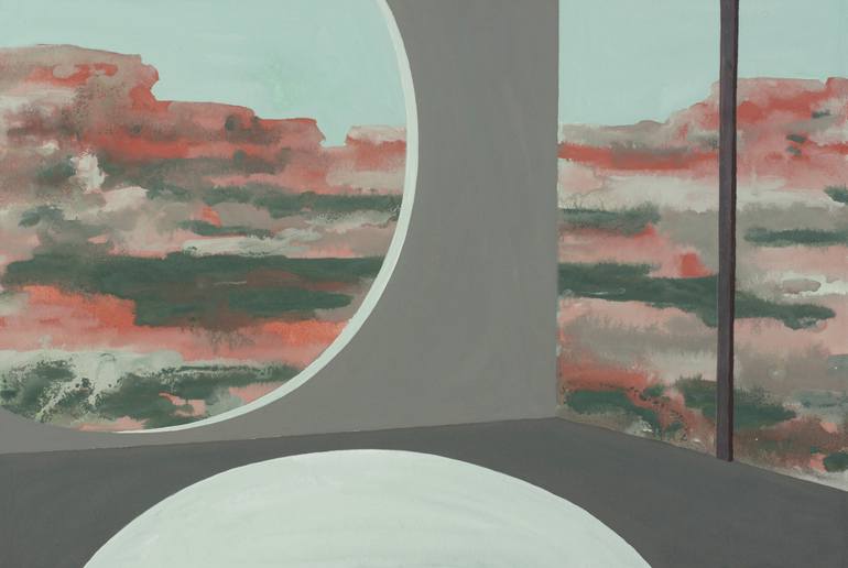 With this painting, one can compare how the use of a circular window frames the landscape, while the pillar on the other wall minimizes and obstructs it. Inspiration for this work comes from views of the desert, arcology, and modern architecture. However, the series of architected landscapes is also...