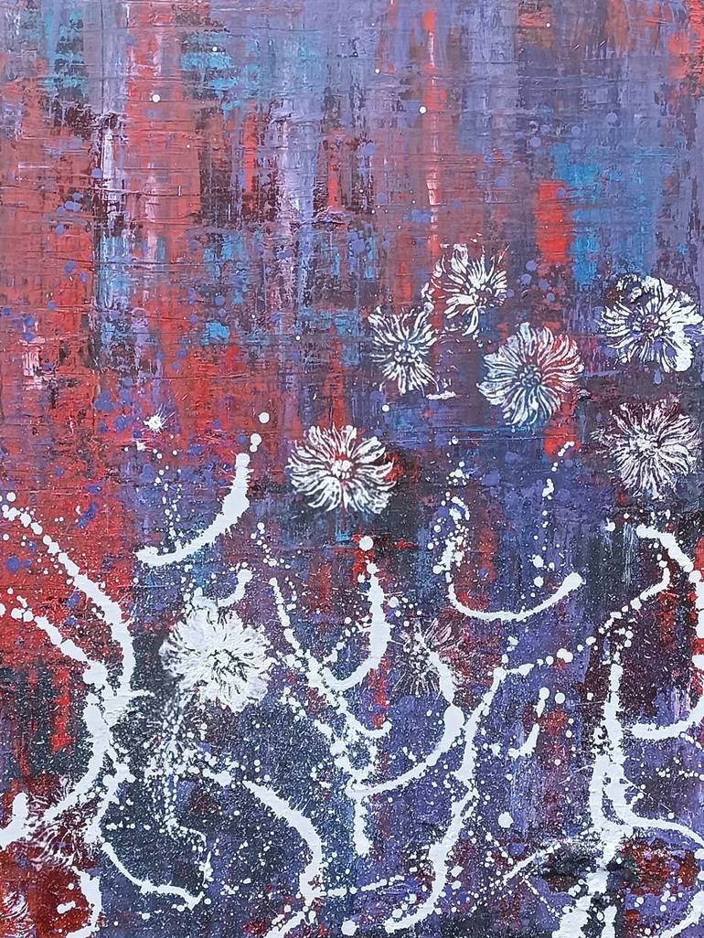 "Cosmic Blossoms" is a captivating fusion of celestial energy and organic beauty, where bursts of radiant light bloom like ethereal flowers against a textured cosmic expanse. The interplay of deep reds, blues, and purples evokes the mystery of the universe, while delicate white forms, reminiscent of...