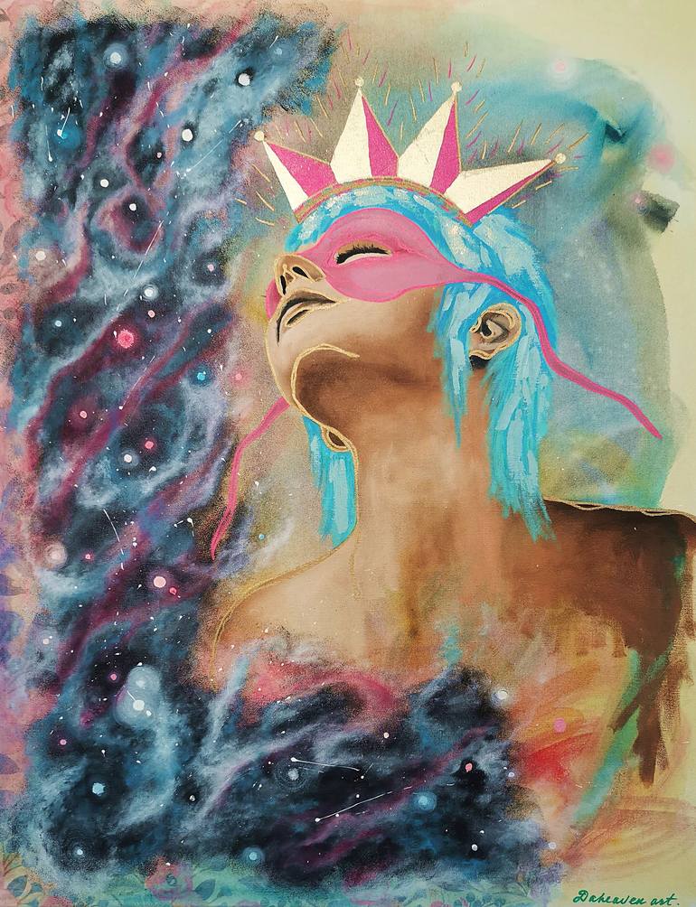 Cosmic Queen - Ethereal Surrealist Art for Modern Home Decor. 90x70cm, oil, acrylic on canvas. Step into the vastness of space with the «Cosmic Queen». This ethereal figure, crowned with radiant starlight, symbolizes the boundless nature of spirit and the infinite potential of personal discovery. Sh...