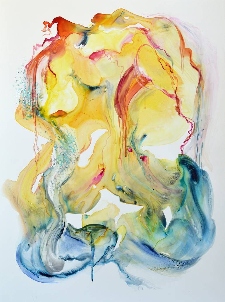 Astrophysics, cosmology, galaxies...are always in my mind and I imagine worlds. This one is the birth of a new world beyond the cosmic microwave background. I love watercolor on YUPO as it makes me free of letting random designs appear and then change it according to my feelings of the moment.