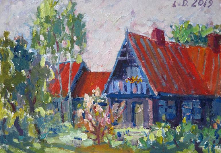 Cottage House original oil painting on canvas. Artwork painted in impressionism stile.