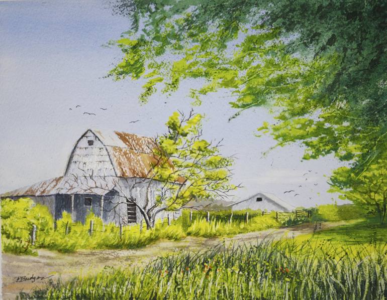 Experience the tranquility of the country with this stunning watercolor painting of a peaceful country lane. The dirt road winds its way through the idyllic countryside, with an old barn nestled amongst the fields and meadows. A large tree casts welcome shade across the lane, creating the perfect sp...