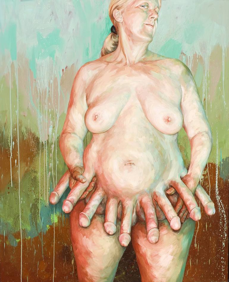 "Coup" addresses the question of how do women embrace attributes of assertion and aggression - which are traditionally male - without losing their femininity. I use the penis to represent the "male" attributes and the skirt to represent femininity. The subject doesn't need to lop off mens' penises ...