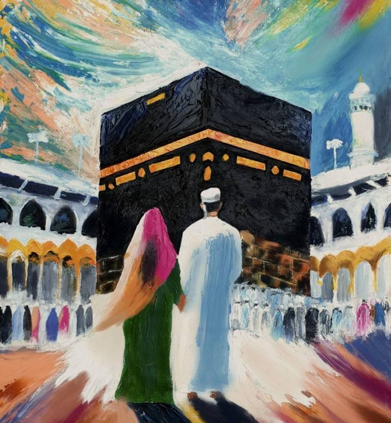 The painting of a couple at the Kaaba can be a heartfelt and meaningful gift to your loved one. It would symbolize your shared spiritual journey, love, and the importance of the Kaaba in your relationship.