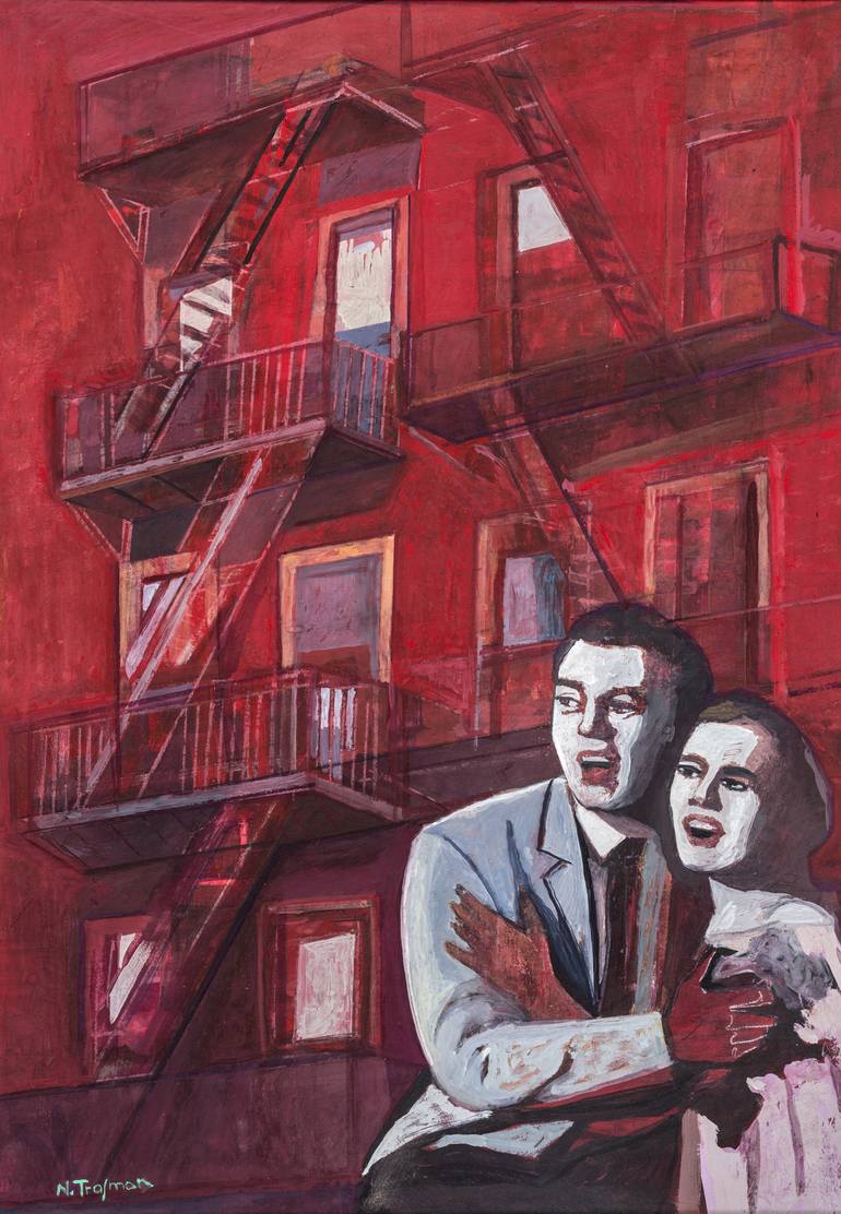 The film West Side Story inspired me a lot. Great dance, great music, great actors. Superb scenography. Superbs urban landscapes .. New york's buildings with stairs and the strong love story of Maria and Tony ! Great urban structure. Technique: tempera that is Pigments mixed with an egg mediu...