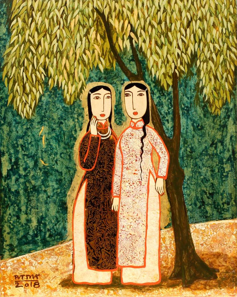 This picture is painted with lacquer on wood, size: 40X50cm, 1.3cm thick. Lacquer painting with pigment, gold, silver, and eggshell. Using the multi-layer lacquer technique, each layer to add silver to create metallic luster for the colors. I love the Vietnamese Ao dai, an outfit that has brought Vi...