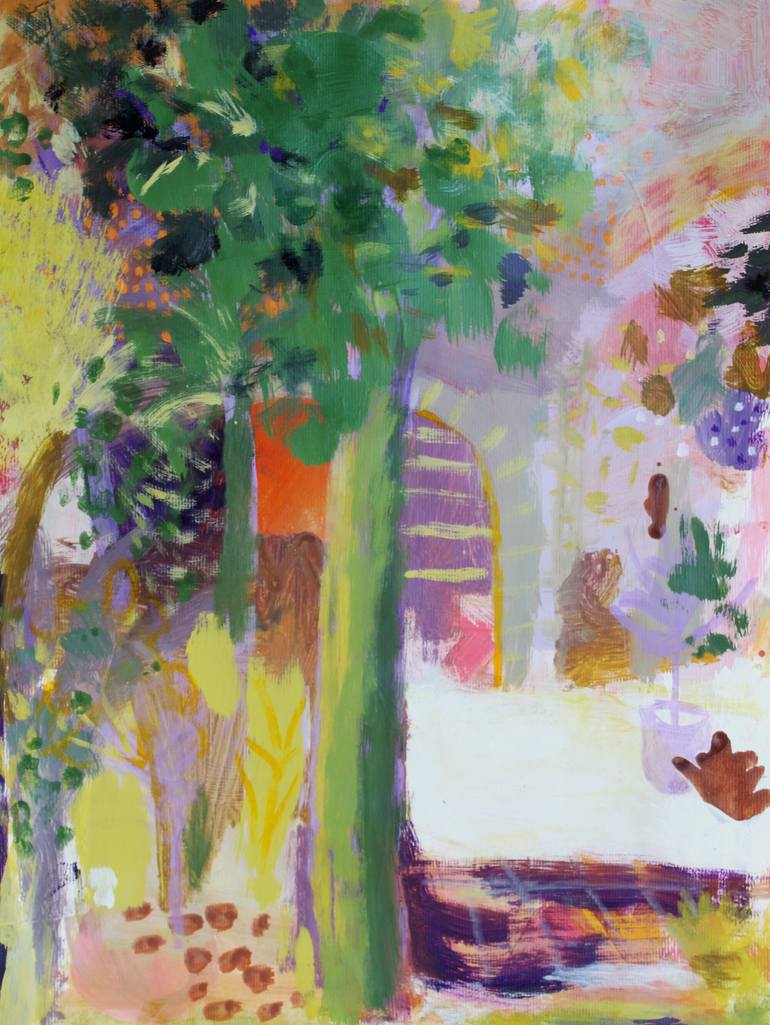 Original acrylic painting on paper, unframed. Colourful study of a courtyard garden in sunlight, with purples, greens and yellows.