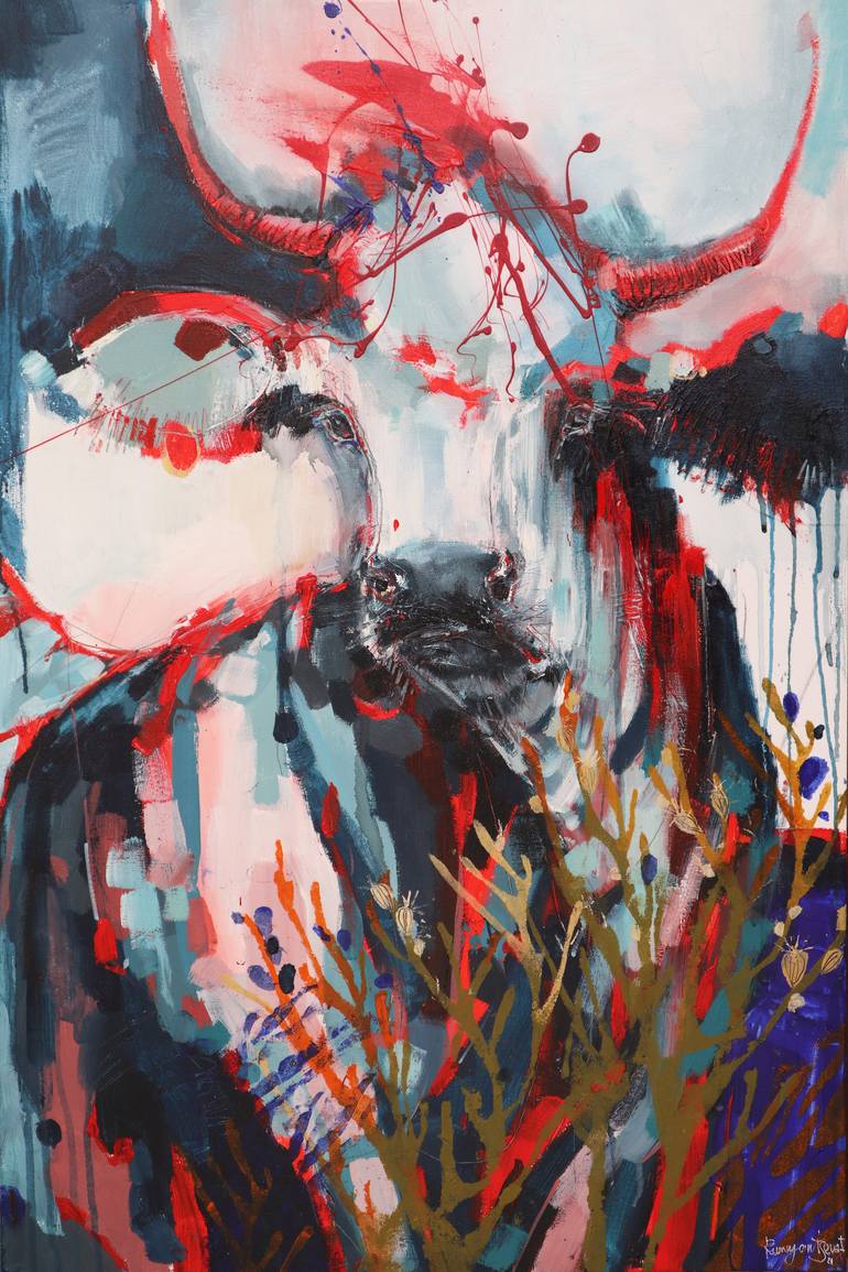 Expressive cow art modern contemporary abstract design. The artist's expressive style of animals and wildlife paintings with thick textured acrylic paint strokes using warm colours. Each cow has it's own individual personality that reflects the mood of the room. The artist's reason for creating thes...