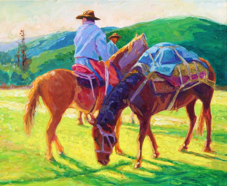 Artwork inspired by meeting of cowboys at sunrise while they were waiting for the rest of the crew to arrive. The cast shadows and morning light add drama to the artwork. The artist has hand crafted a decorative wood frame to match artwork. This frame and framing is included with artwork ready to ...