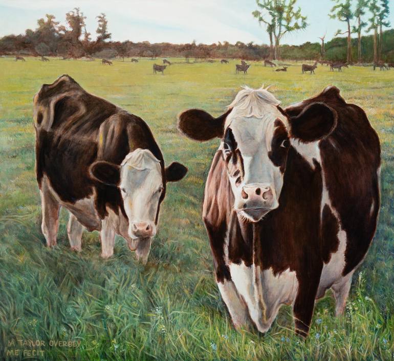 This artwork beautifully captures the serenity of pastoral life with a detailed portrayal of cows in a lush, sunny field. The foreground features two cows, rendered with remarkable attention to detail and texture that brings out the softness of their fur and the contemplative expression in their eye...